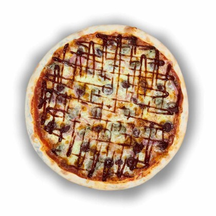 Томатный соус, сыр моцарелла, бекон, болгарский перец, маслины, свиное филе, куриное филе. 440 гр