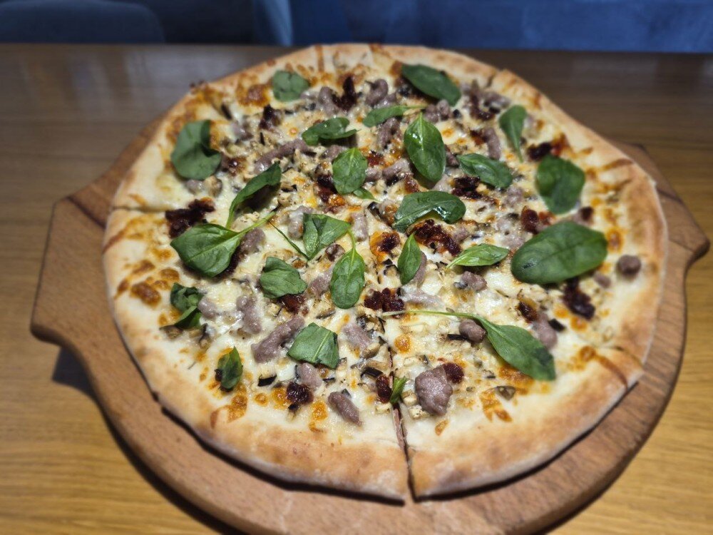 Сливочная основа, сыр моцарелла, хрустящий баклажан, вяленые томаты, свиной фарш, зелень