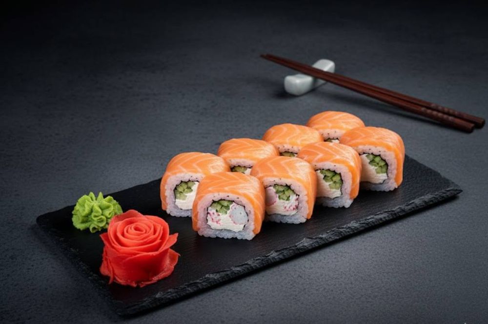 Рис,нори,крем сыр,огурец,краб,креветка,лосось
