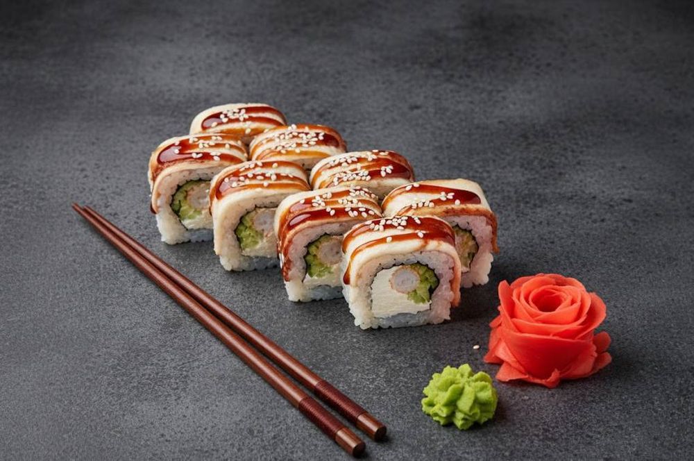 Рис,нори,крем сыр,огурец,креветка,угорь,унаги соус,масаго,кунжут