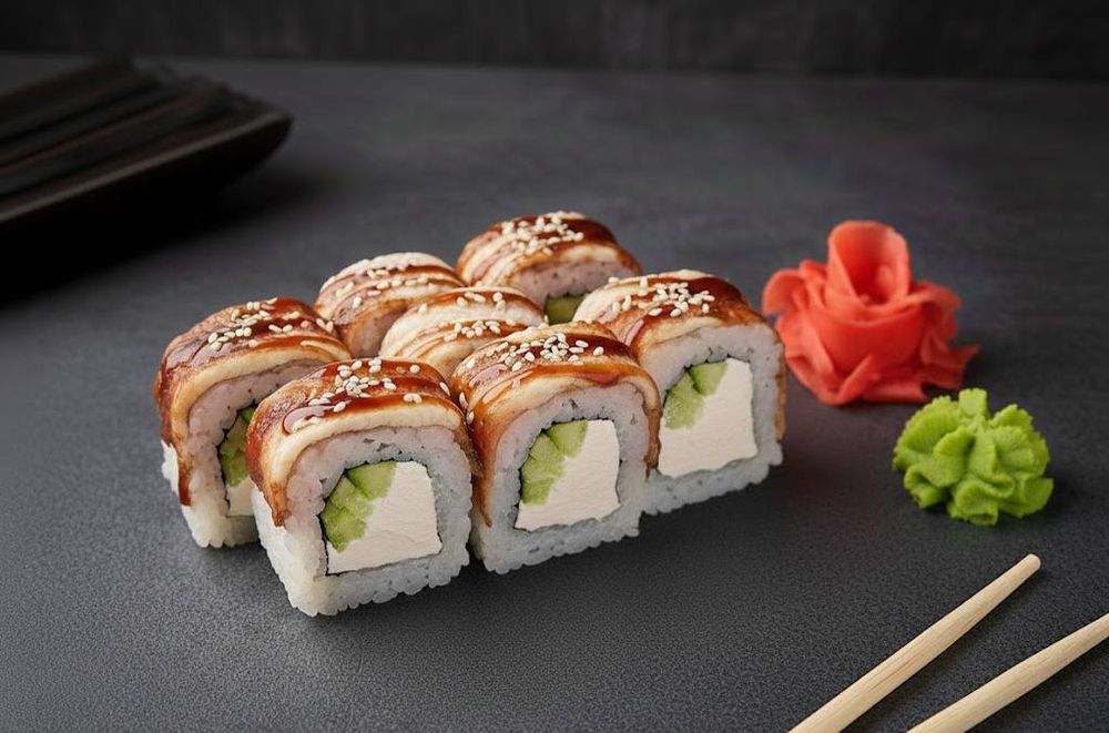 Рис, нори, крем сыр, авокадо, угорь, унаги соус