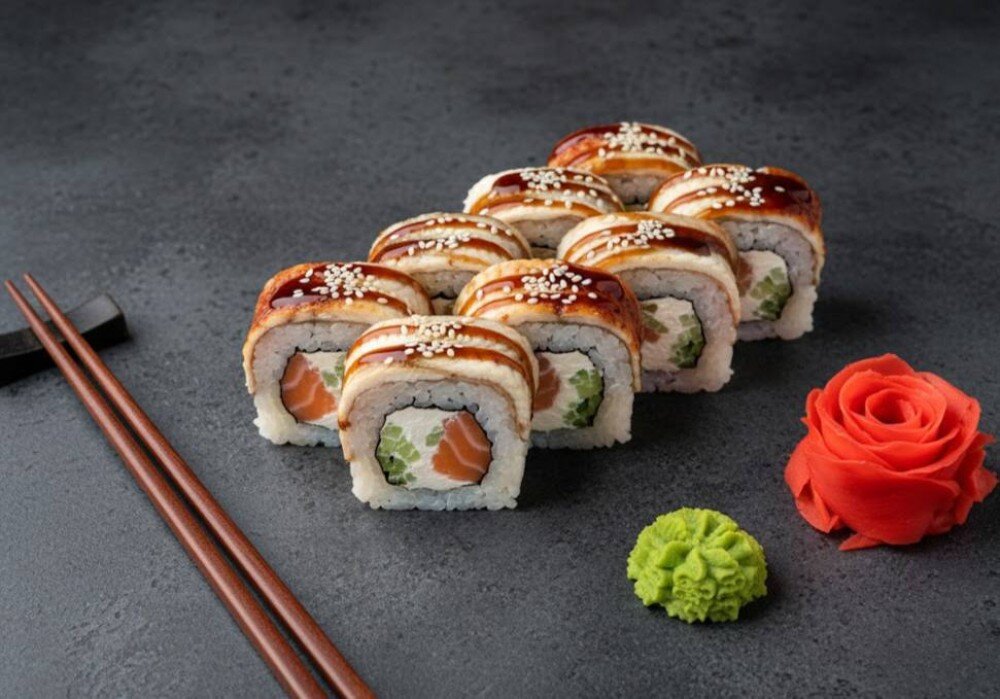 Рис,нори,крем сыр,огурец,лосось,угорь,унаги соус,кунжут,имбирь,васаби,соевый соус