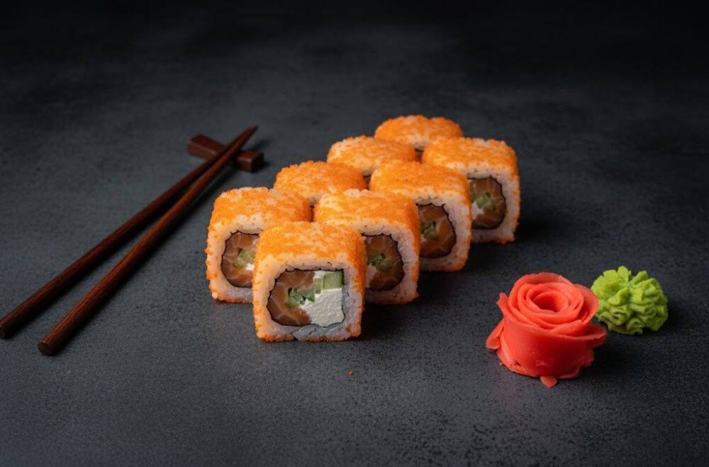 Рис,нори,масаго,крем сыр,огурец,лосось,имбирь,васаби,соевый соус