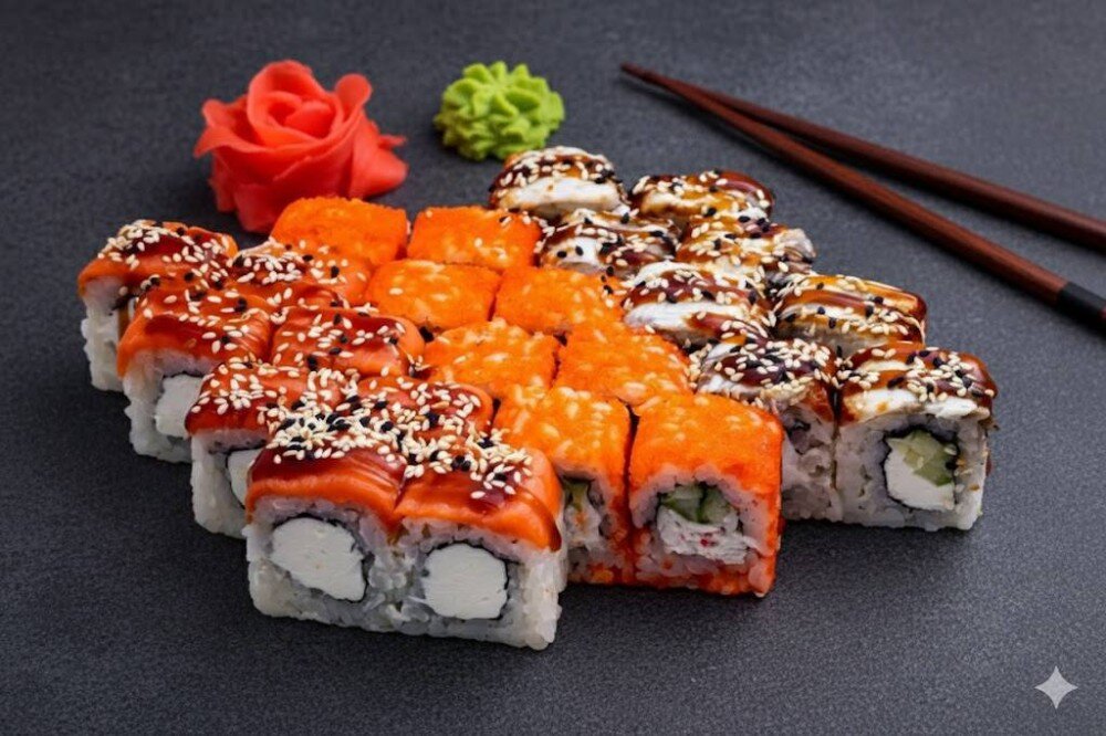 Канада классическая,Калифорния с крабом,Филадельфия чиз,соевый соус,имбирь,васаби