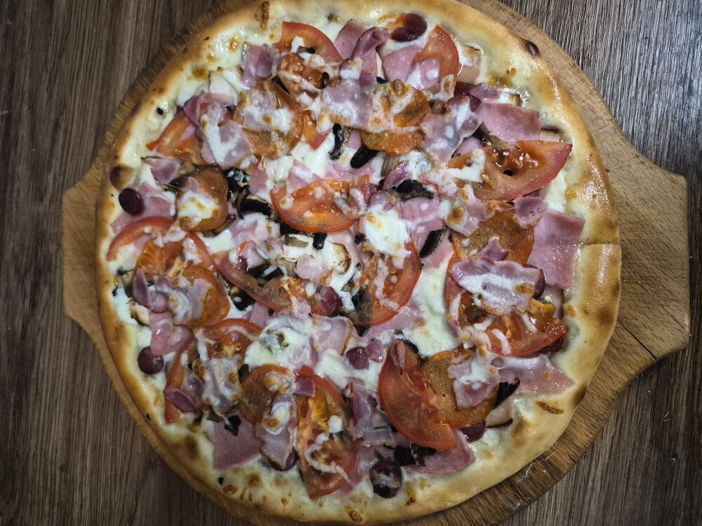 Сливочная основа,буженина,охотничьи колбаски,копченый окорок,ветчина,шампиньоны,помидор,сыр моцарелла